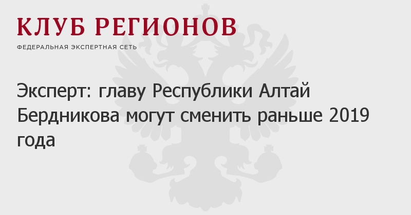 Напомним, что полномочия действующего главы Республики Алтай истекают в 2019г. Генеральный директор Центра развития региональной политики Илья Гращенков сомневается в возможности нового губернаторского срока Бердникова: «Очевидно, для Республики Алтай назрела необходимость смены главы региона. Это продиктовано не столько эффективностью управления, сколько тем, что регион депрессивный и нужен новый вектор развития. Еще до 2019г. там может произойти смена губернатора».