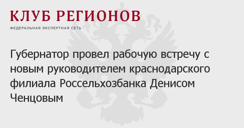 Губернатор провел рабочую встречу с новым руководителем краснодарского филиала Россельхозбанка Денисом Ченцовым