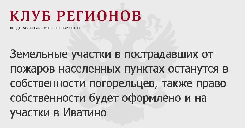 Земельные участки в пострадавших от пожаров населенных пунктах останутся в собственности погорельцев, также право собственности будет оформлено и на участки в Иватино
