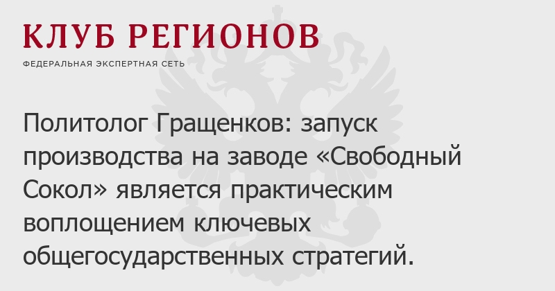 Политолог Гращенков: запуск производства на заводе «Свободный Сокол» является практическим воплощением ключевых общегосударственных стратегий.