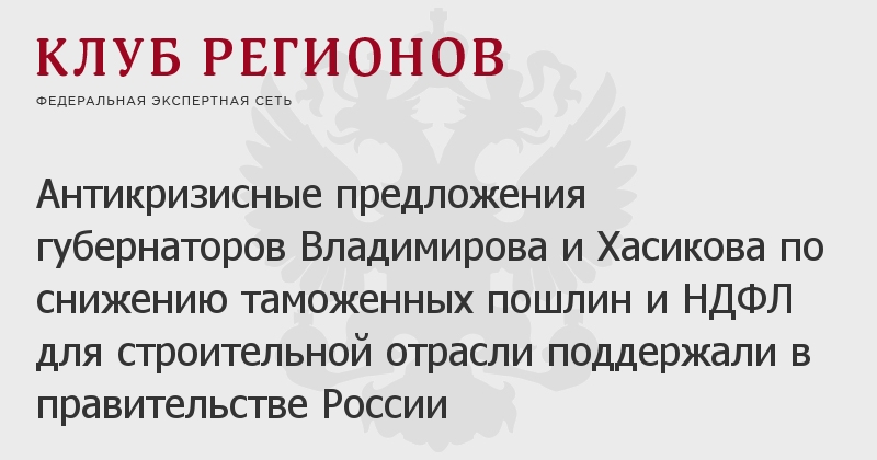 Антикризисные предложения губернаторов Владимирова и Хасикова по снижению таможенных пошлин и НДФЛ для строительной отрасли поддержали в правительстве России