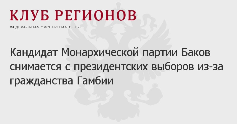 Свою кандидатуру с выборов президента России снимает руководитель Монархической партии Антон Баков. Он заявил, что такое решение принято в связи с тем, что он имеет двойное гражданство. «Я вынужден снять свою кандидатуру, так как имею гражданство Гамбии. Это не позволяет мне участвовать в выборах», – цитирует Бакова ТАСС.