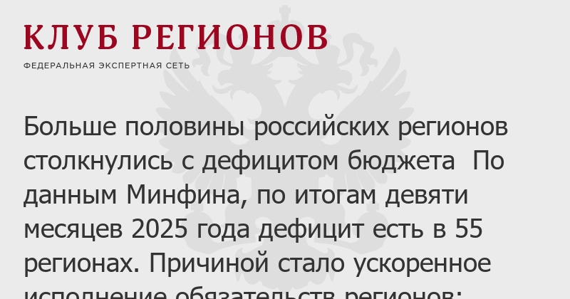 Больше половины российских регионов столкнулись с дефицитом бюджета По данным Минфина, по итогам девяти месяцев 2025 года дефицит есть в 55 регионах. Причиной стало ускоренное исполнение обязательств регионов: опережающий рост расходов составил 14,6% отн